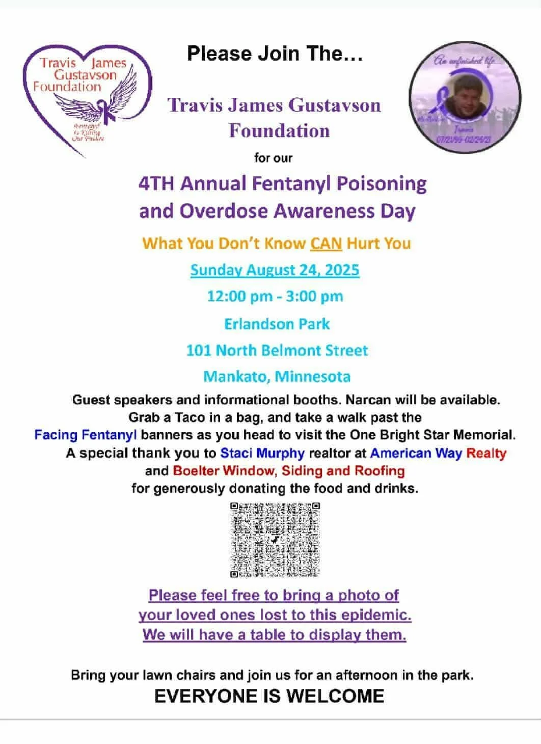 Mark your calendars for August 24th, 2025, and plan to attend our 4th Annual Fentanyl Poisoning and Overdose Awareness Day Event to be held at Erlandson Park, in Mankato, Mn